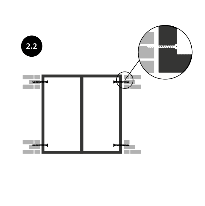 Zorg dat de DTS dorpel om de 150 mm verankerd wordt aan de constructie of met een spouwlat om krimpen en uitzetten van de dorpel bij temperatuurverschillen te voorkomen. Ondersteun de onderdorpel van het kozijn op meerdere plekken, maar in ieder geval onder de stijlen, dit zijn de belangrijkste punten.