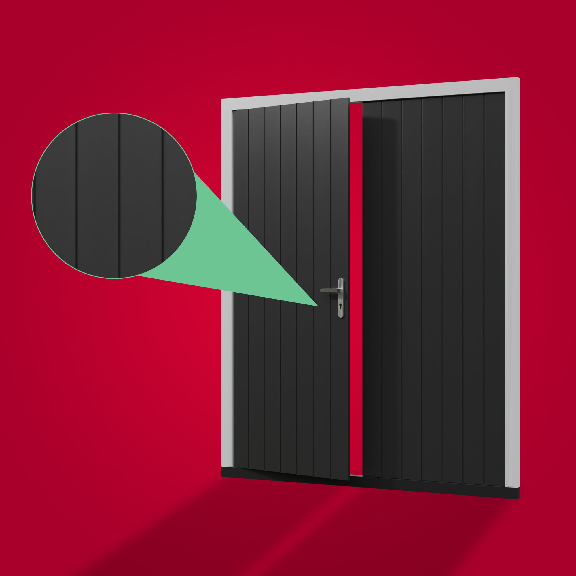 Hierbij zijn de houten openslaande garagedeuren om esthetische redenen voorzien van verticale groeven. Het is mogelijk om te kiezen voor platte groeven (ongeveer 12 mm breed) of een V-groef (4 mm breed). De keuze voor een van deze opties is gebaseerd op voorkeur van het aangezicht.