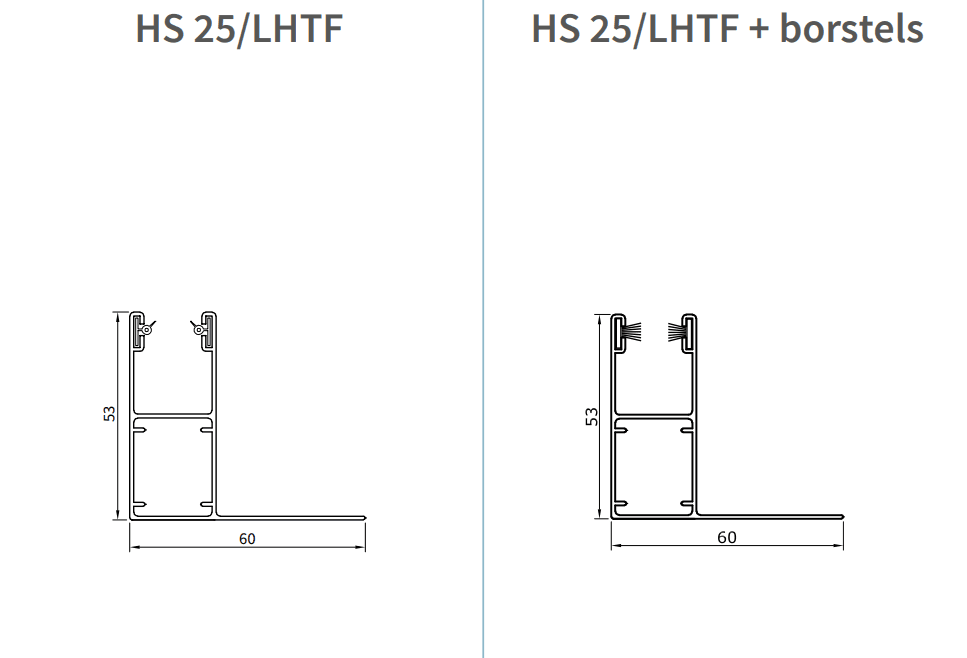 Het verschil tussen deze twee geleiders is dat de rechtergeleider, aangeduid als “Hs 25/LHTF + borstels,” is uitgerust met borstels aan de binnenkant. Deze borstels helpen bij het afdichten en zorgen voor extra bescherming tegen vuil, stof of andere kleine deeltjes die tussen de geleider en het bewegende deel kunnen komen.