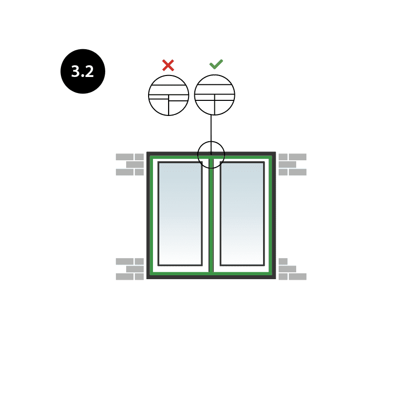 Zorg dat de DTS dorpel om de 150 mm verankerd wordt aan de constructie of met een spouwlat om krimpen en uitzetten van de dorpel bij temperatuurverschillen te voorkomen. Ondersteun de onderdorpel van het kozijn op meerdere plekken, maar in ieder geval onder de stijlen, dit zijn de belangrijkste punten.