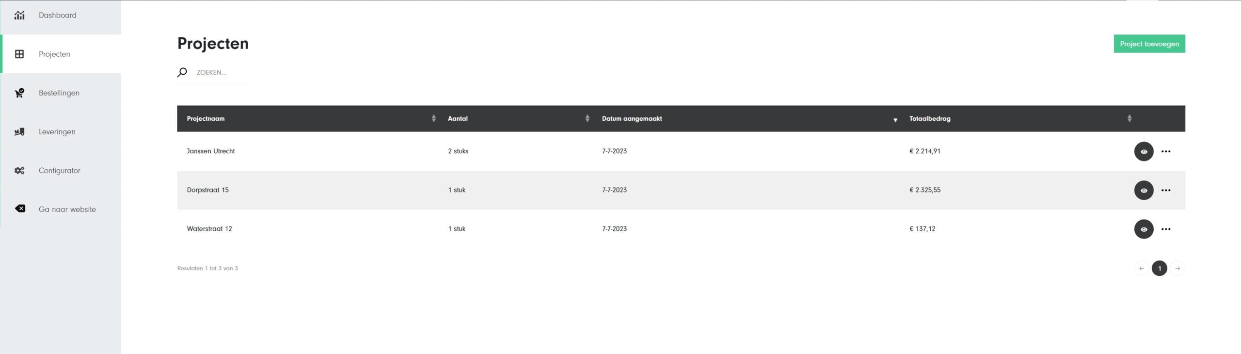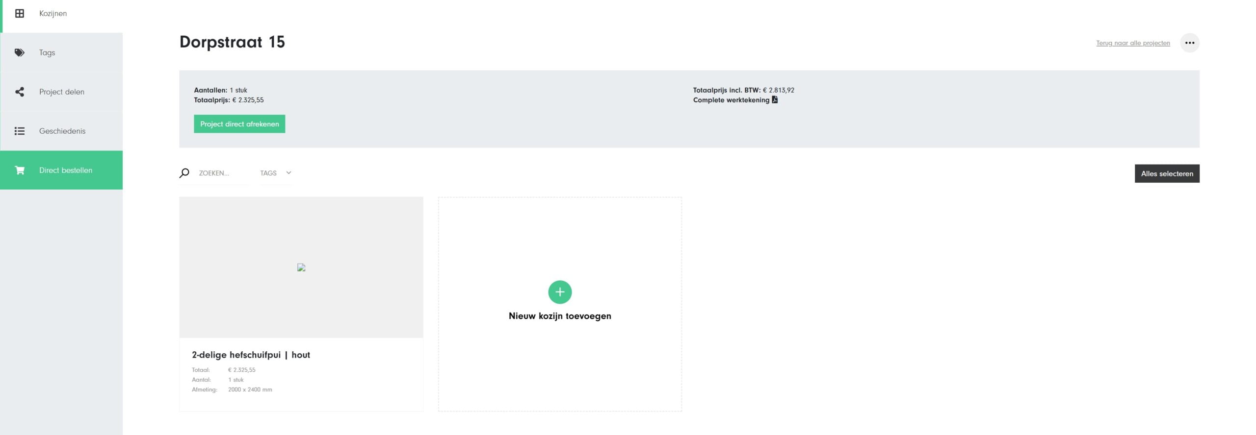 Het bestellen en afrekenen van een project is heel eenvoudig. Zorg ervoor dat je bent ingelogd en ga naar jouw account. In de menubalk van je ‘dashboard’ zie je staan ‘projecten’. Klik op een project dat je eerder hebt aangemaakt. Wil je nog wijzigingen doen of een kozijn toevoegen? Geen probleem, je kunt alle kozijnen nog individueel bewerken.