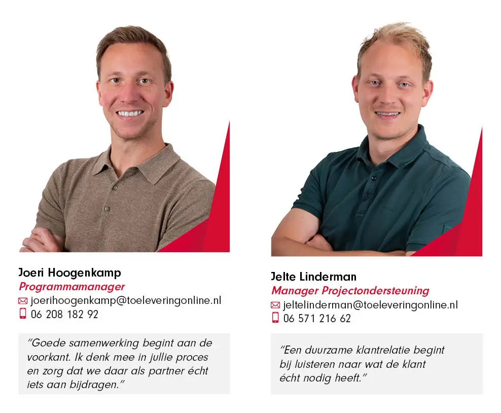 Herken je ook dat tekenwerk 4 keer heen en weer gestuurd moeten worden voordat je de kozijnen hebt ingekocht bij je kozijnleverancier? Toelevering Online helpt grotere bouwbedrijven versnellen. Dankzij ons digitale platform kunnen afdelingen – van calculatie en werkvoorbereiding tot inkoop en administratie – samenwerken in één omgeving. Daarnaast profiteer je van directe prijzen en korte levertijden en heb je maximale regie over ieder project – met één leverancier als aanspreekpunt!