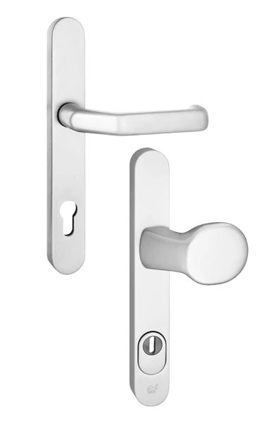 De kunststof buitendeuren worden compleet geleverd met garnituur inclusief kerntrekbeveiliging. In de afbeelding hieronder zie je een voorbeeld van het beslag.